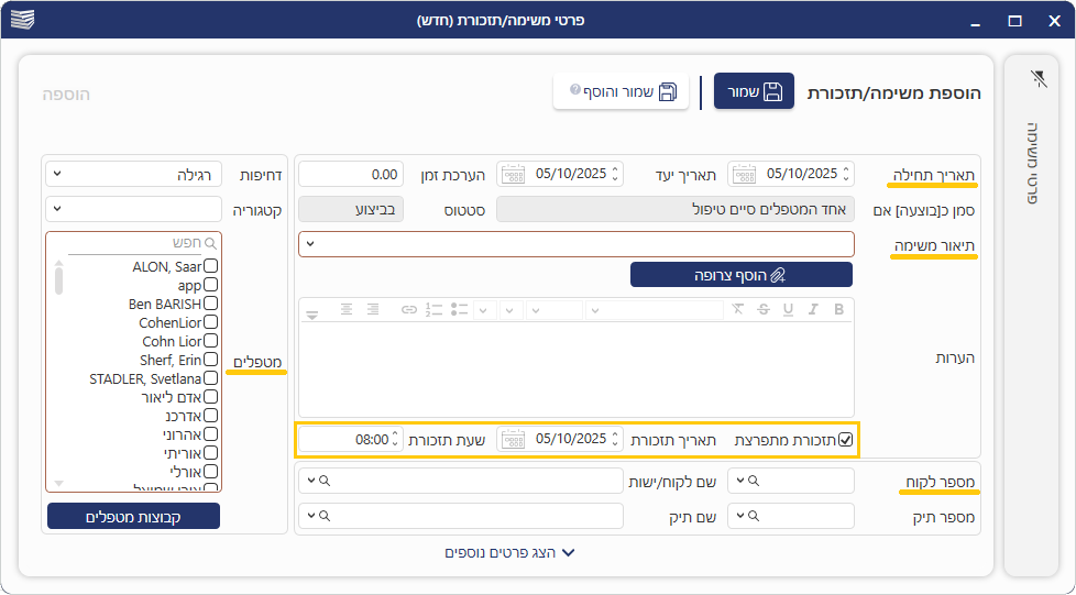 - ניתן לקשר את המשימה לכרטיס לקוח/תיק (בהוספת משימה מתוך כרטיס תיק, המערכת תמלא את הפרטים אוטומטית).