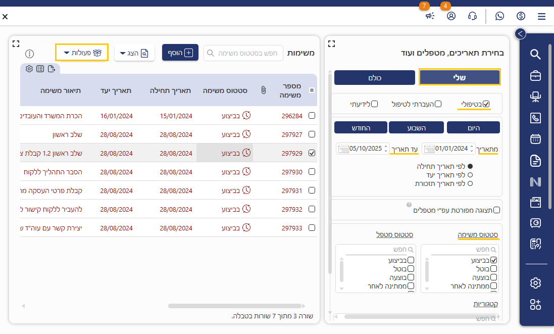 - ניתן לסנן את רשימת המשימות לתצוגה לפי טווח תאריכים, סטטוס ושמות מטפלים.