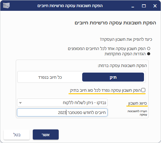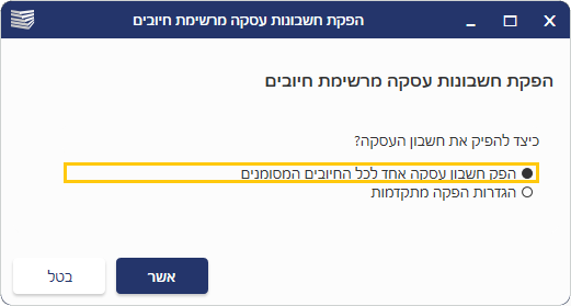 בחרו האם להפיק חשבון עסקה אחד לכל החיובים המסומנים,