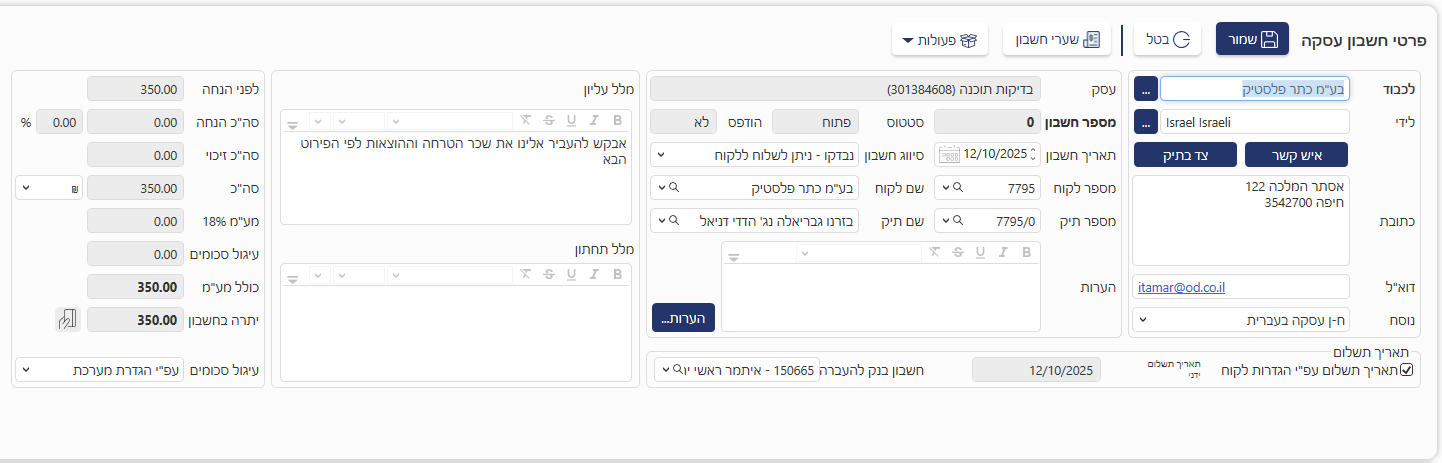 • שדה "לכבוד" – כאן המקום להקליד את שם המשלם. שם הלקוח יופיע אוטומטית וניתן לשנותו.