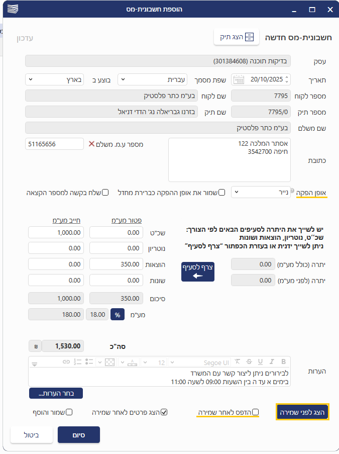 להצגת החשבונית לפני הסיום לחצו על הכפתור [הצג לפני שמירה]