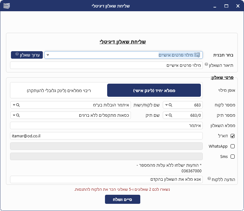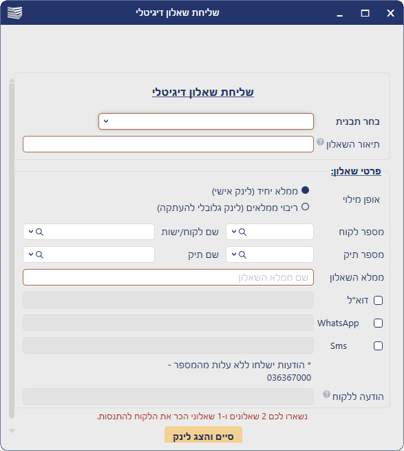 3. ייפתח חלון "שליחת שאלון דיגיטלי".
