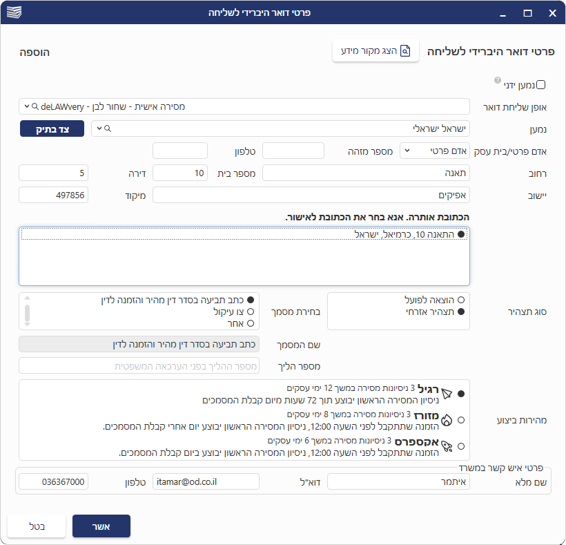 יש לבחור בשליחה דרך דואר ישראל או שליחות פרטית דרך חברת deLAWvery.