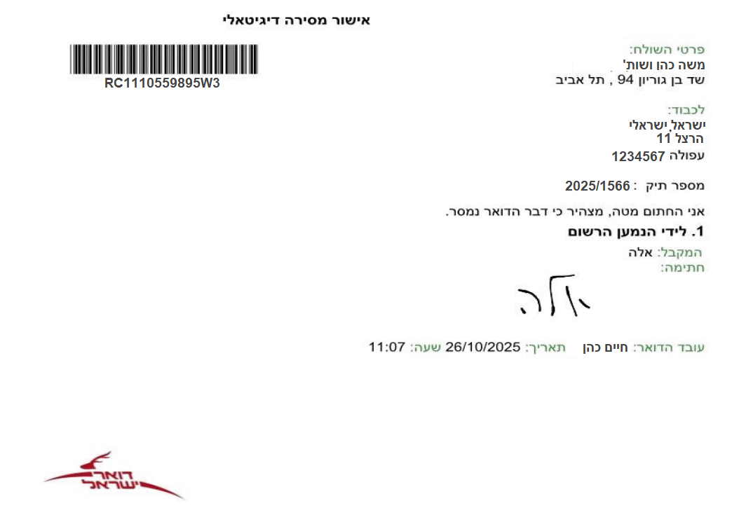 במידה ומשרדך בחר בסוג משלוח הכולל "אישור מסירה",