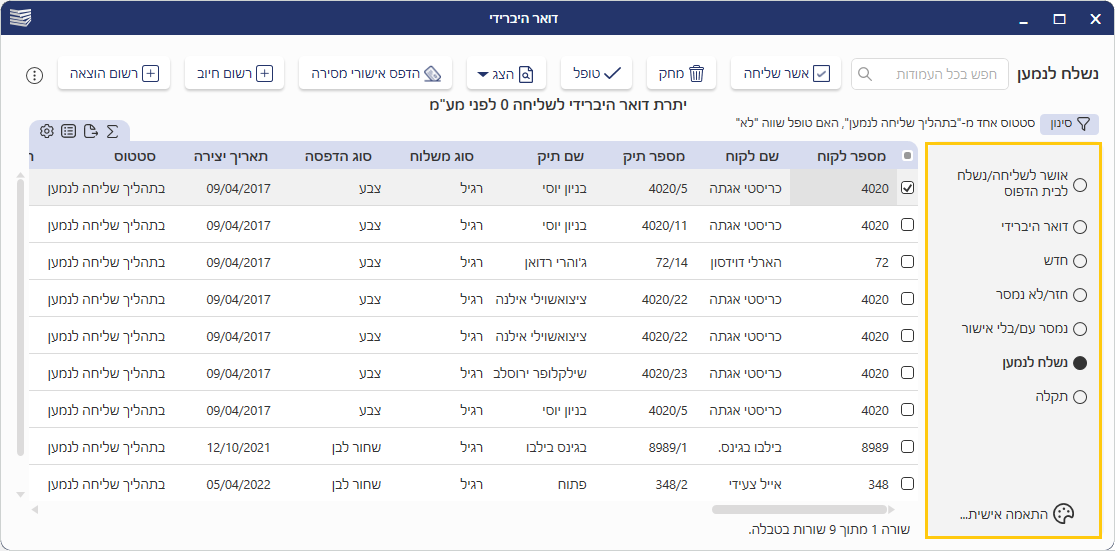 "נשלח לנמען", "דואר חזר" "נמסר" ו"לא נמסר". לסיום לחצו על [אשר].