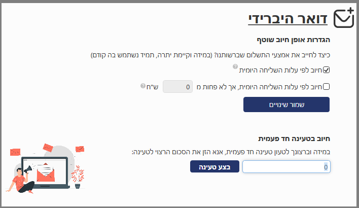 תוכלו להגדיר סכום המינימלי לחיוב. כלומר, במידה ונשלחו מכתבים ב-100 ש"ח ומוגדר חיוב מינימלי של 1000 ש"ח,