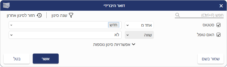 2. במסך הסינון שייפתח, שימו לב שהסטטוס הוא "חדש" ולחצו על [אשר].