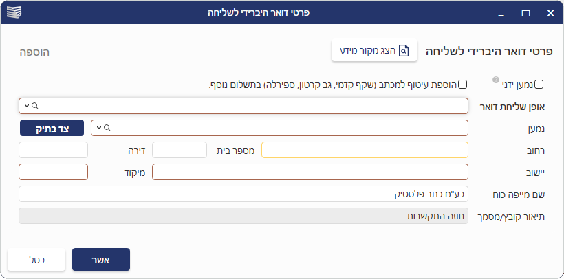 בחלון שייפתח, באופן שליחת דואר, ומלאו את פרטי הנמען: