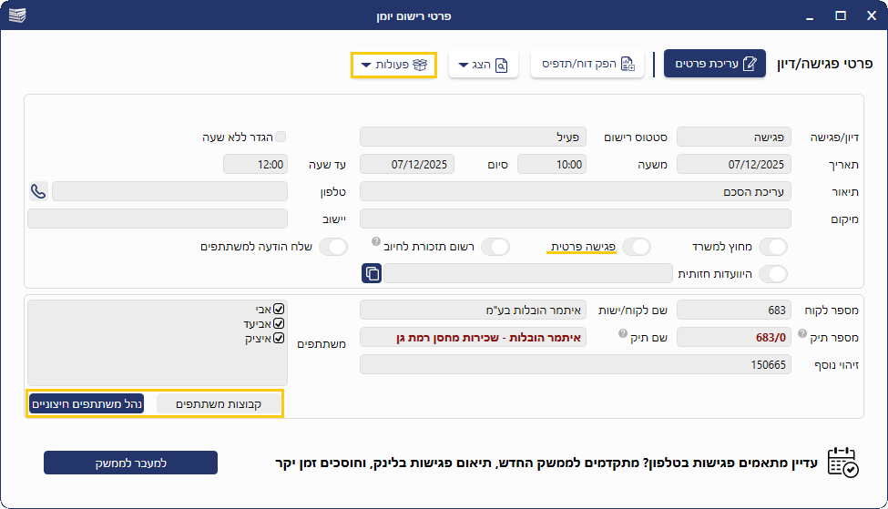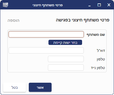 לחיצה על הכפתור תאפשר להוסיף לרישום הפגישה, משתתפים שאינם חלק מצוות המשרד.