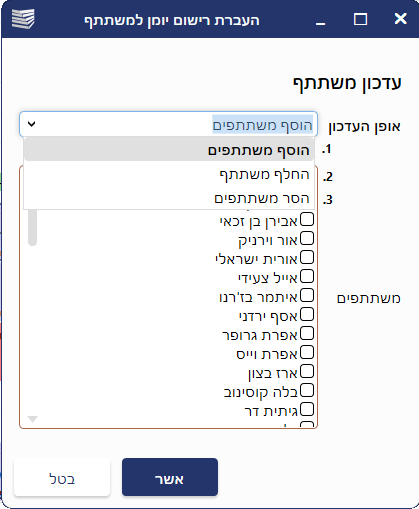 עדכון משתתפים – בחירה בפעולה, תציג רשימת אפשרויות לבחירה.