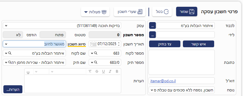 הפקת חשבונות העסקה ובתהליכי הגבייה.