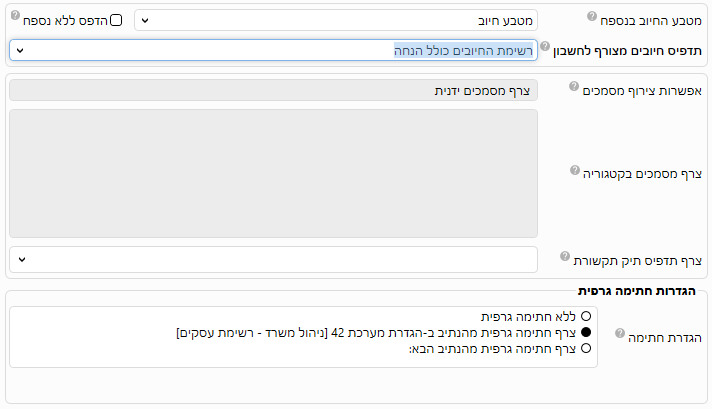 אשר יופיע אוטומטית בעת הפקת חשבון עסקה, ושדות בחירה כמו אופן הצגת מטבע החיובים בנספח.