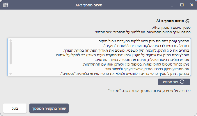 לשמירת הסיכום בתקציר הקובץ, בכרטיס הלקוח/תיק או ברשימת המסמכים הכללית, לחצו על כפתור [שמור בתקציר הקובץ].
