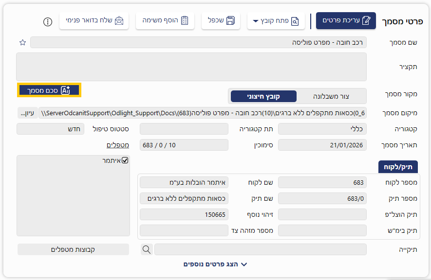 לשמירת המסמך בכרטיס הלקוח/תיק או ברשימת המסמכים הכללית, לחצו על כפתור [שמור סיכום מסמך].