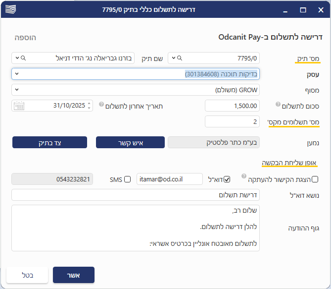 משרדים שרכשו את המודול יכולים לשלוח ללקוח לינק לתשלום באשראי, ישירות מעודכנית.