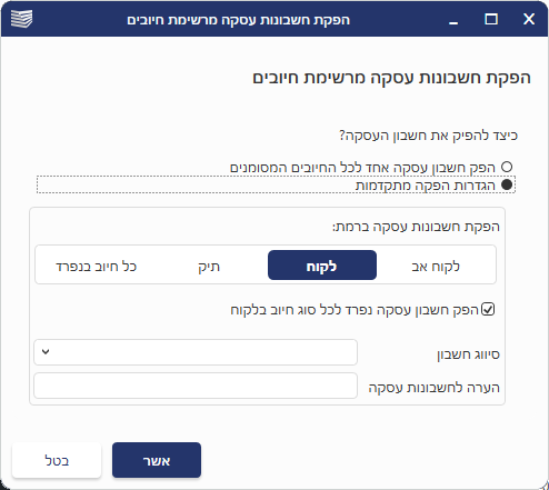 כמו הפקת חשבון עסקה ברמת לקוח אב, לקוח, תיק או עבור כל חיוב בנפרד? סמנו את האפשרות "הגדרות הפקה מתקדמות".