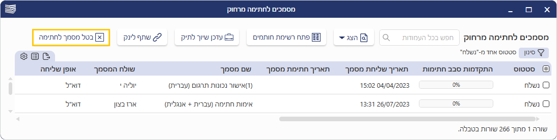 ניתן לסמן מסמך אחד בלבד, וללחוץ על הכפתור [בטל מסמך לחתימה].