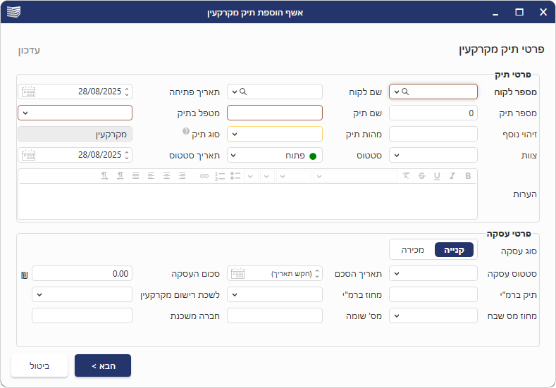 כרטיס התיק החדש מכיל את כל השדות הנחוצים לעולם עסקאות הנדל"ן, כמו רישום ברמ"י ונתוני גוש/חלקה.