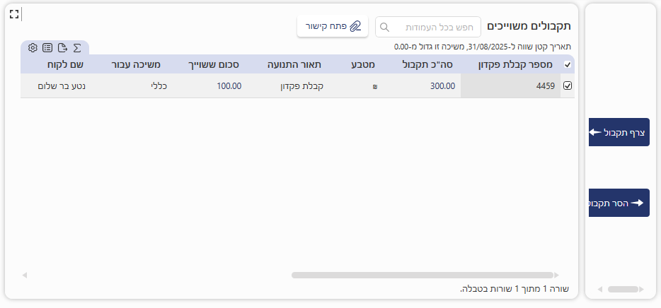 כדי לבצע שיוך מחדש, ניתן לסמן את התקבול שמקושר למשיכה וללחוץ על כפתור [הסר תקבול].