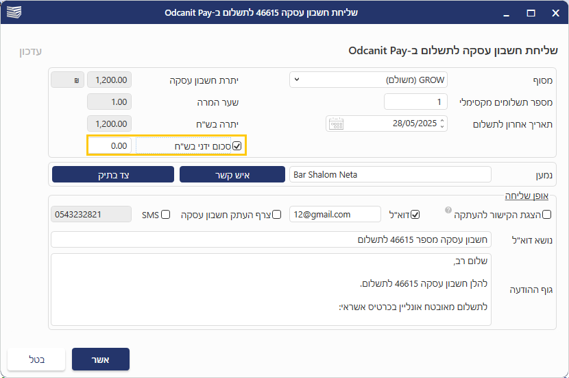 בגרסה החדשה, הוספנו אפשרות לשליחת לינק לתשלום חלקי של החשבון עסקה, במקום הסכום הכולל