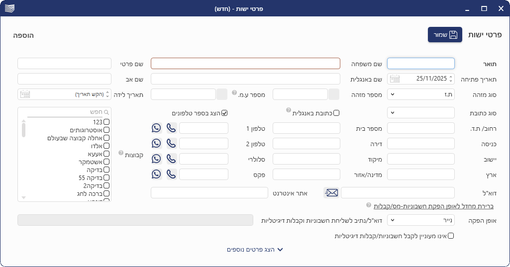 - שדה "קבוצות" – ניתן לצרף את הישות לקבוצת ישויות, לצורך סינונים והפקת דוחות.