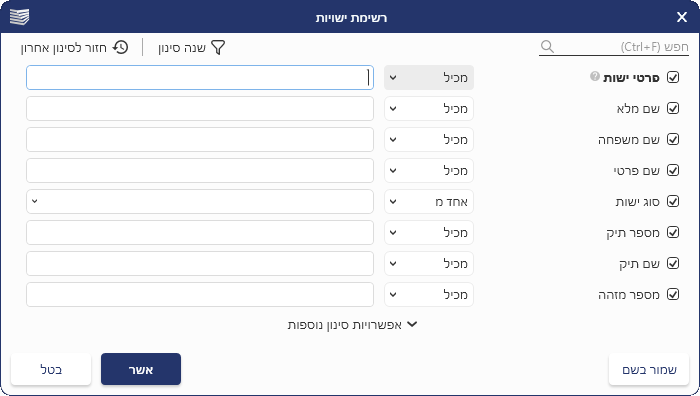 לחיצה על כפתור [אשר] ללא הזנת תנאים לחיפוש, תציג את רשימת כלל הישויות בתוכנה.
