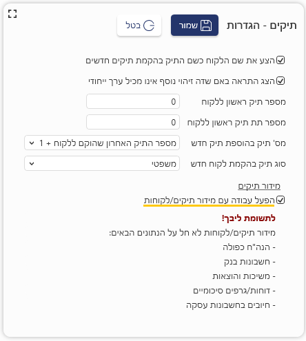 כדי להפעיל את האפשרות למידור תיקים ולקוחות, יש לבצע מספר הגדרות מערכת.