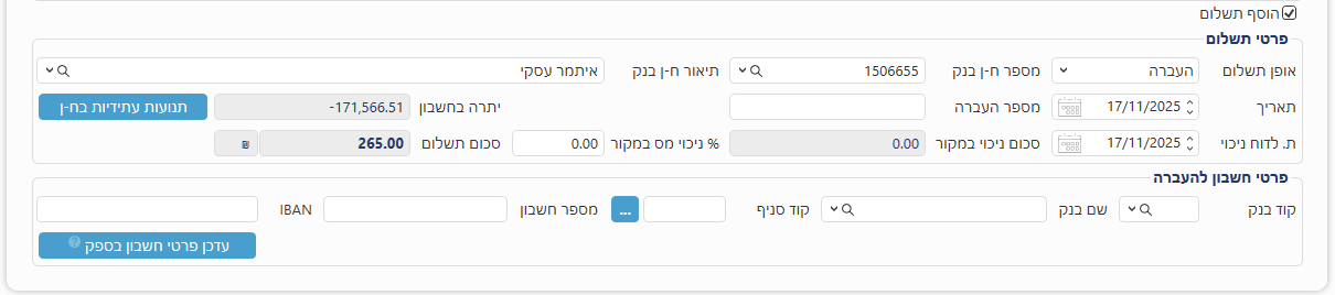 - שדה "מספר ח-ן בנק" – שדה חובה. יופיע במידה ובחרתם באמצעי תשלום כמו מזומן או העברה. בחרו את חשבון הבנק שלכם שהוגדר בתוכנה.