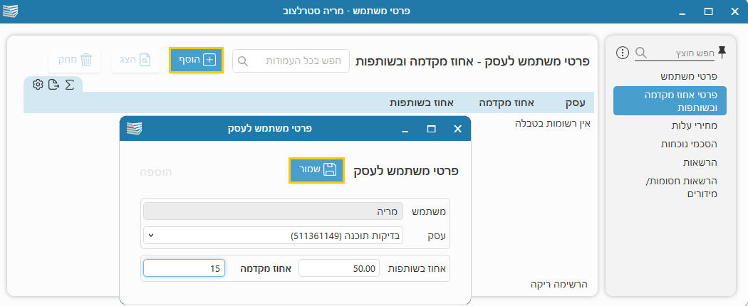 4. במסך שייפתח, הקלידו את "אחוז בשותפות" ו"אחוז מקדמה".