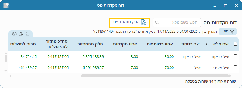 1. במסך הראשי ← תפריט כספים ← דו"ח מקדמות מס.