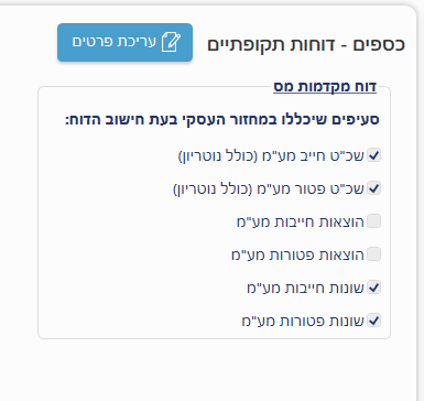 דרך הגדרות המערכת ניתן לקבוע אילו סעיפים מתוך חשבונית מס/קבלה או חשבונית מס ,יכללו בדו"ח מקדמות מס בתוכנה.