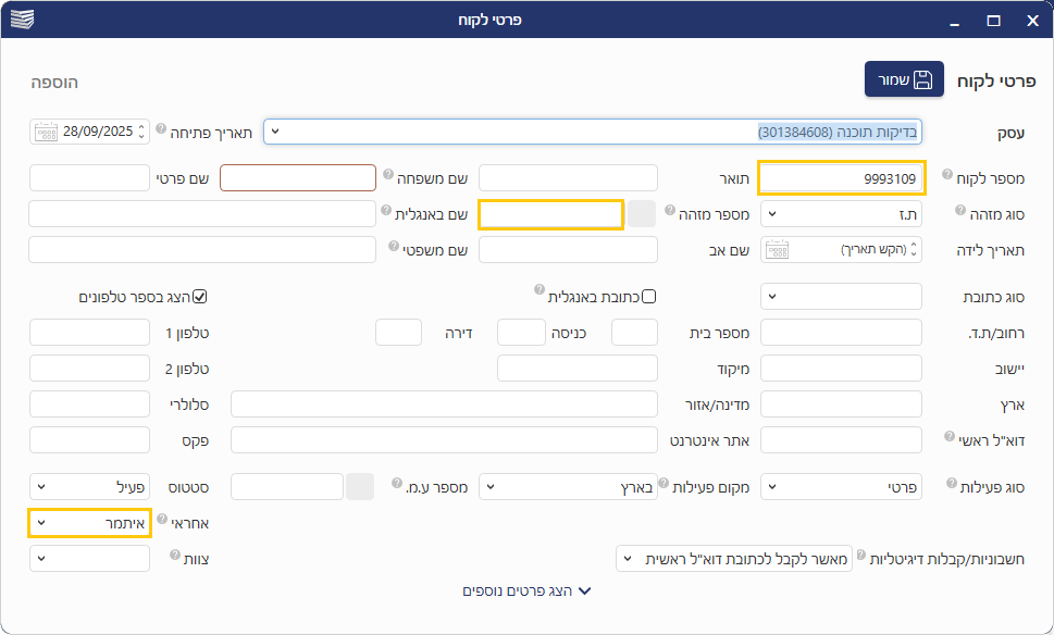 ייפתח מסך טופס פרטי לקוח, המכיל שדות מידע שונים. בשיעור זה נעבור על השדות העיקריים: